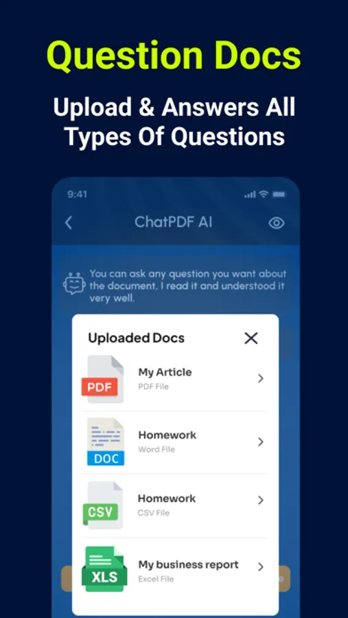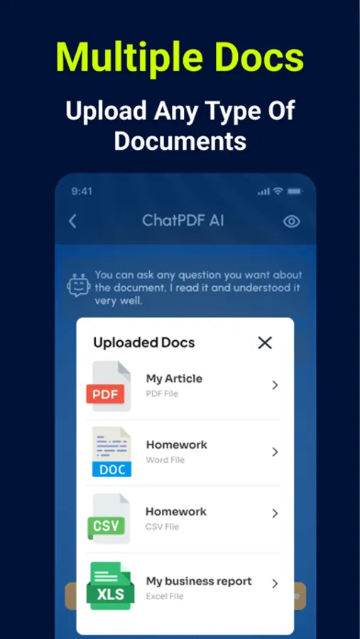 ChatPDF AI: Scan & Summarize offers versatile support for all kinds of documents. From PDFs to Word documents and everything in between, our app ensures that no file is left behind. Using our advanced document scanner feature, you can digitize printed documents and convert them into summaries in seconds. Whether it’s a research paper, a contract, or a presentation, ChatPDF AI helps you manage and summarize documents with ease.
