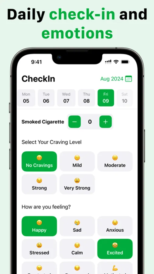 • Daily Check-In – Log your thoughts and stay accountable each day as you quit smoking.