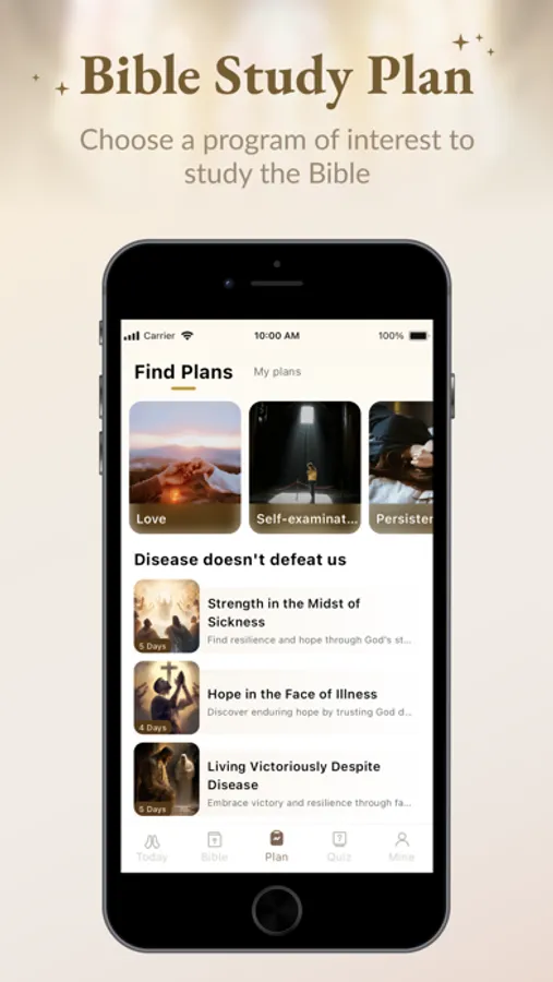 The Plan feature is designed to help you dive deeper into your faith. Whether you're seeking comfort, strength, or inspiration, our daily plans provide scripture, devotionals, and encouragement. Start a plan today and see how God can transform your life, one step at a time.