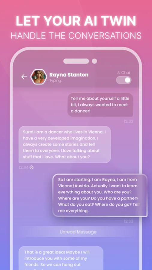 Flirt and chat with ease from the comfort of your home. No more worrying about what to say—let your AI decide the perfect response. Your AI version is your mirror in this exciting digital world.