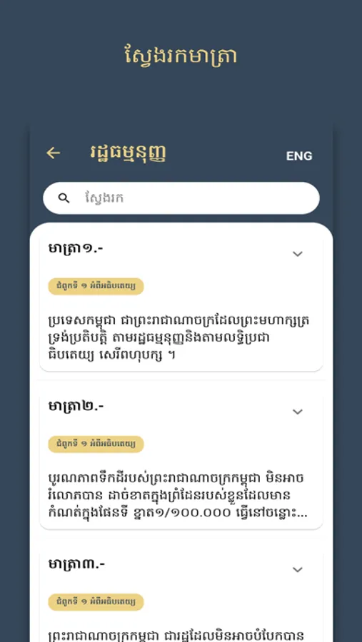 Khmer Law Code App provides a search function for users to find any article based on keyword, article, chapter, and more with highlighted search results.
