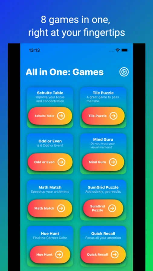 Dive into a world of fun and challenge with "All in One: Games," where you'll find a collection of 8 engaging games designed to sharpen your mind, improve your cognitive skills, and provide endless entertainment. Whether you're looking to boost your memory, enhance your logical thinking, or simply enjoy some quick brain exercises, this app has something for everyone.