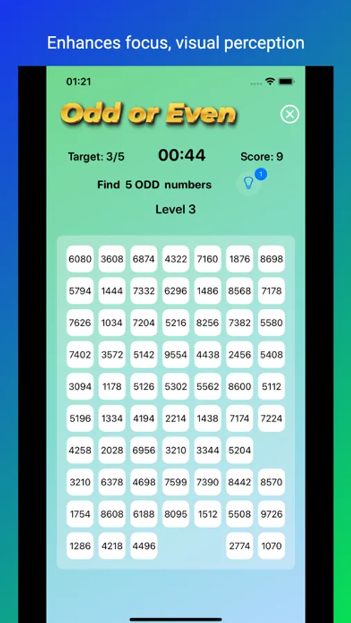 Odd or Even? is a quick and simple game that sharpens your mathematical thinking. Identify, for example, 5 different odd or even numbers as quickly as possible. This game is perfect for improving number sense and reaction time for both kids and adults.
