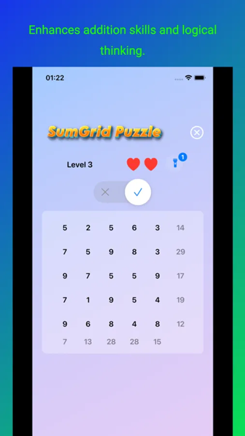 SumGrid Puzzle combines logic and arithmetic. Select or eliminate numbers so that the sum of each row and column matches the given values. This game challenges your mathematical reasoning and problem-solving skills while providing brain-stimulating fun.