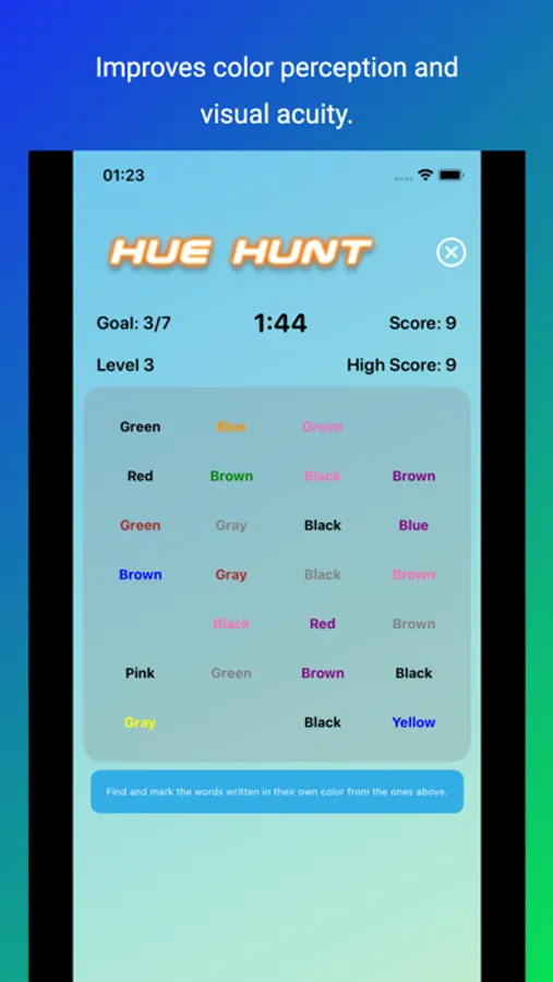 Put your color perception to the test with Hue Hunt! Find and mark the words written in their own color from the ones above. This game is perfect for enhancing your visual discrimination and attention to detail, providing a relaxing yet challenging experience.