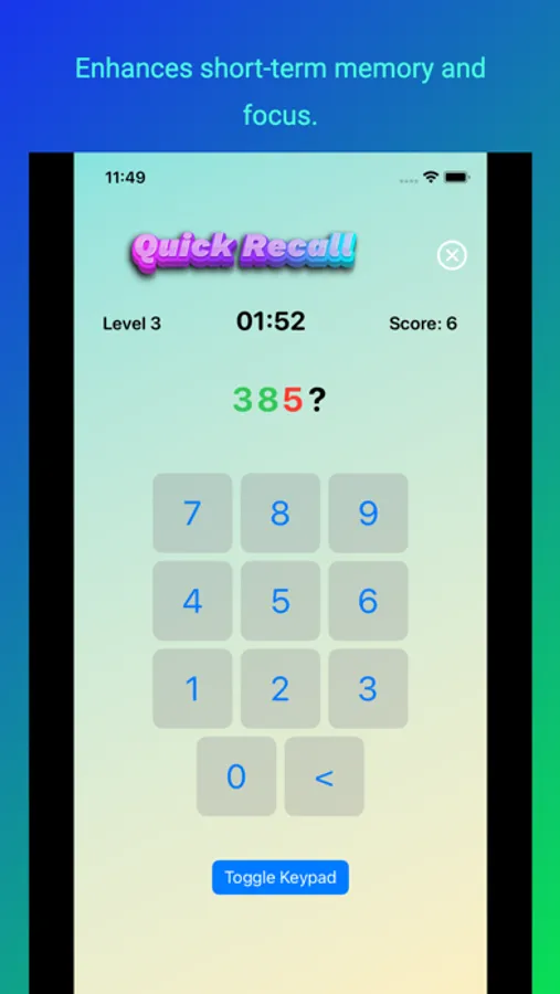 Quick Recall is designed to improve your short-term memory and cognitive speed. You’ll be shown a series of numbers for a brief moment—your task is to recall and enter them correctly. It’s a simple yet effective way to train your brain and boost your memory skills.
