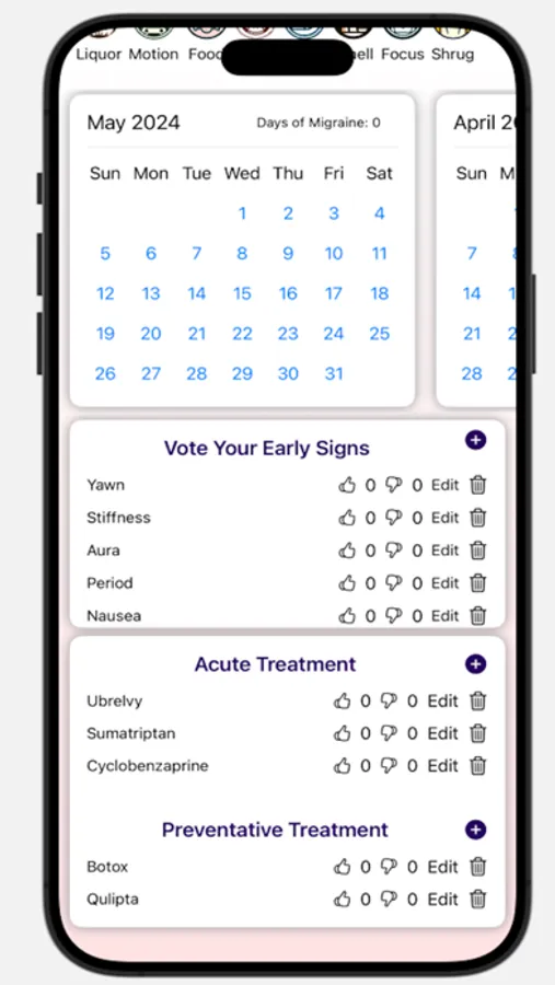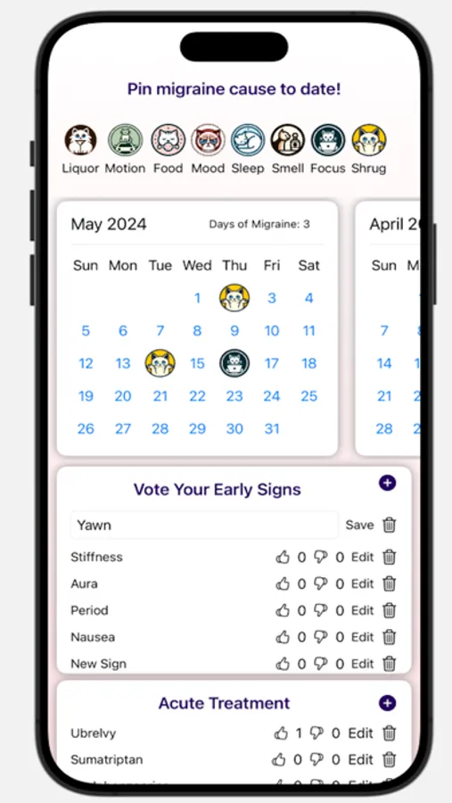 I'm on a quest to find a great migraine tracker that works for me, and this is better than the majority that I've found, but could still use some work. Pros: -Free -Can add as many early signs, acute treatment methods, and preventative treatment methods as you want -Cat theme, which is fun because most apps don't have any themes or fun Cons: -Can't record pain intensity -Can't record any symptoms during your migraine/headache, only warning symptoms -Can only choose one trigger for the entire day, which is a (fun) cat pin you place on the calendar day -Can customize all of the early signs, acute/preventative treatment methods to be whatever you want them to be -Only 10 trigger options Improvement Suggestion: Doesn't have ANY guidance at all, so it's just pushing some buttons until you figure out how it works, which doesn't take TOO long, but just a smidge of instruction would be appreciated.