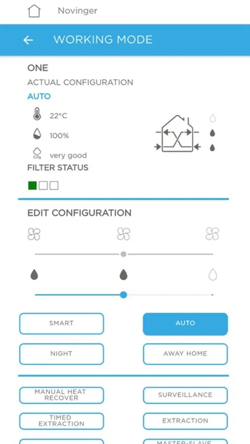 Thanks to NVG app, you can choose among more than ten different operating modes (Automatic, Manual, Surveillance, Smart, Out-of-Home, Timed Ejection, Night, Intake, Extraction, Airflow) and four airflows.