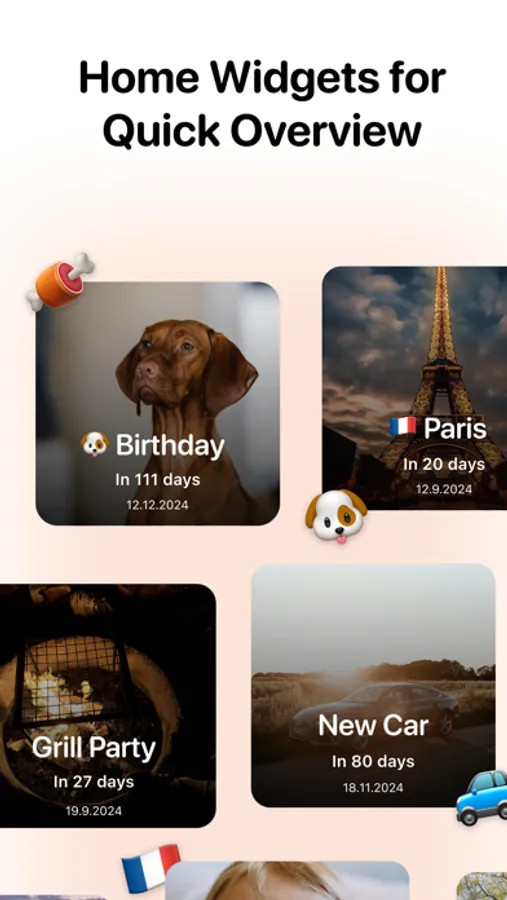 Set countdown to your favorite events effortlessly. With an intuitive interface and a wide range of personalisation options, you’ll always be ready to celebrate.