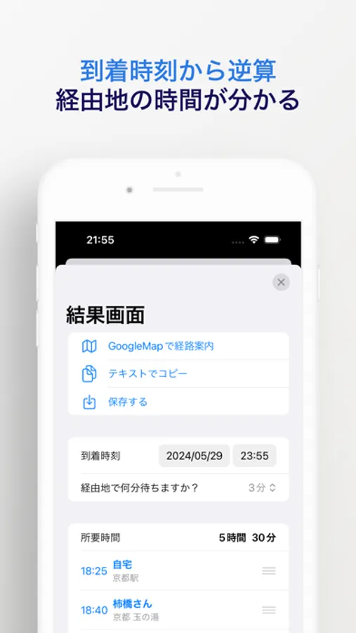 • 時間管理機能:指定した到着時刻に合わせて、出発すべき時刻を自動計算。