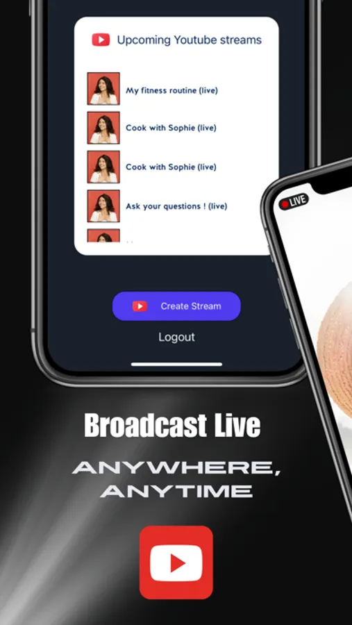 With Kast Live, you can connect to your Google account and effortlessly go live on YouTube with just one click. Whether you want to start a new live stream or select a previously created one, Kast Live makes it easy to broadcast directly from your smartphone.