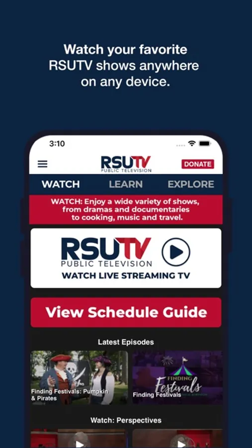 Stream live local TV, entertainment, and educational content on the free RSUTV App. Watch your favorite RSUTV shows anywhere, on any device! Watch for new programs being added for endless entertainment. Stream locally produced programs, award-winning documentaries, full-length TV shows, live music and much more.