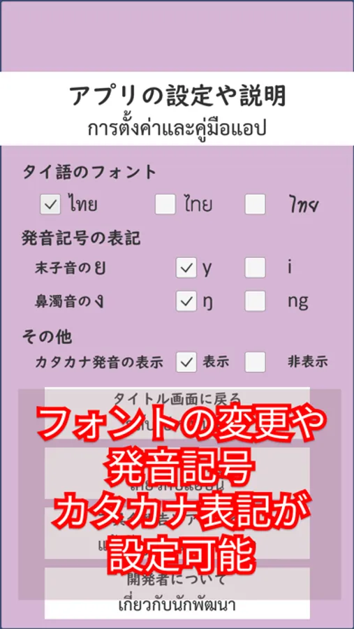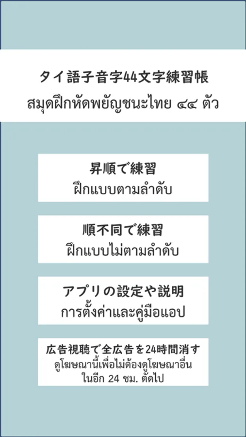 このアプリはタイ語のアルファベットつまり子音字44文字を覚えるためのアプリです。
