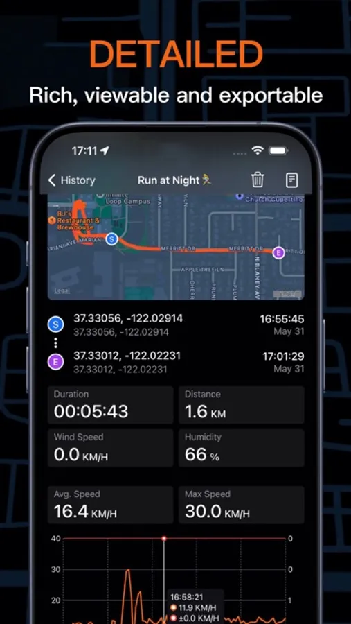 This speedometer not only provides real-time and precise speed monitoring but also captures and records comprehensive trip data. From highest speed, average speed, trip distance, and altitude to direction, trip movement and stop time, temperature, and weather information, we save and display it all for you. You can even export this data in GPX format for further analysis and sharing.