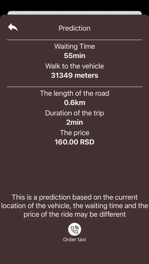 Aplikacija omogućuje naručivanje najbližeg taksi vozila uz mogućnost pregleda cene vožnje pre potvrde narudžbe. Program radi na Engleskoim i Srpskom jeziku.