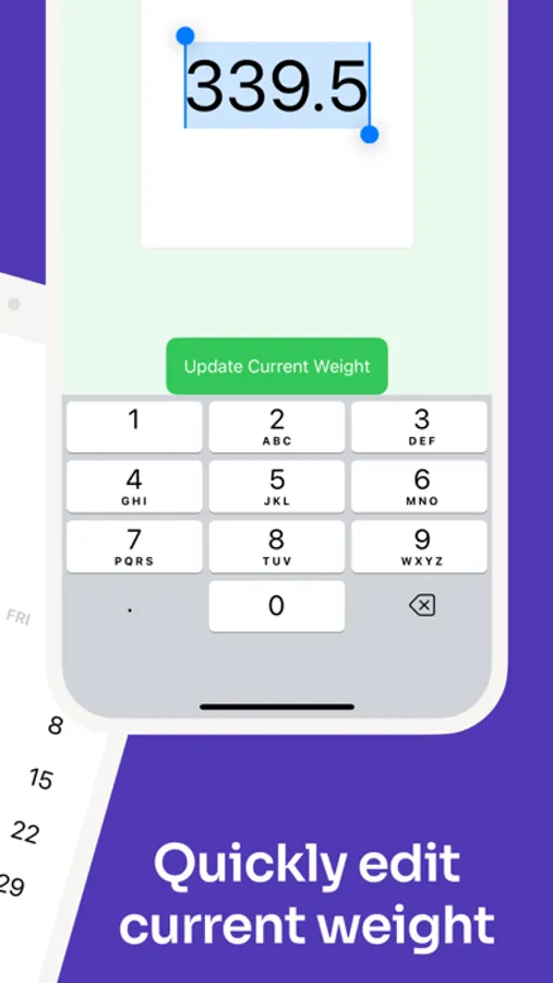 Customizable Goal Weight: Set and track your starting weight, current weight and goal weight–then track your progress to your goal.