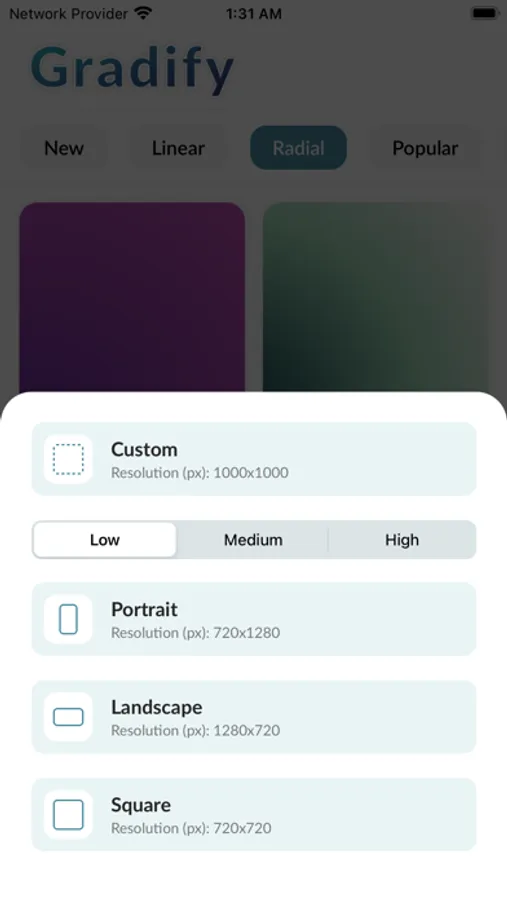 With Gradify, downloading your ideal wallpaper is easy. Choose from low, medium or high resolution in portrait, landscape or square orientation to fit perfectly on any screen. Do you need a specific size? Our custom size feature ensures that your wallpaper fits perfectly. Save your favorite gradients in the app for quick access and transform the look of your device with ease.