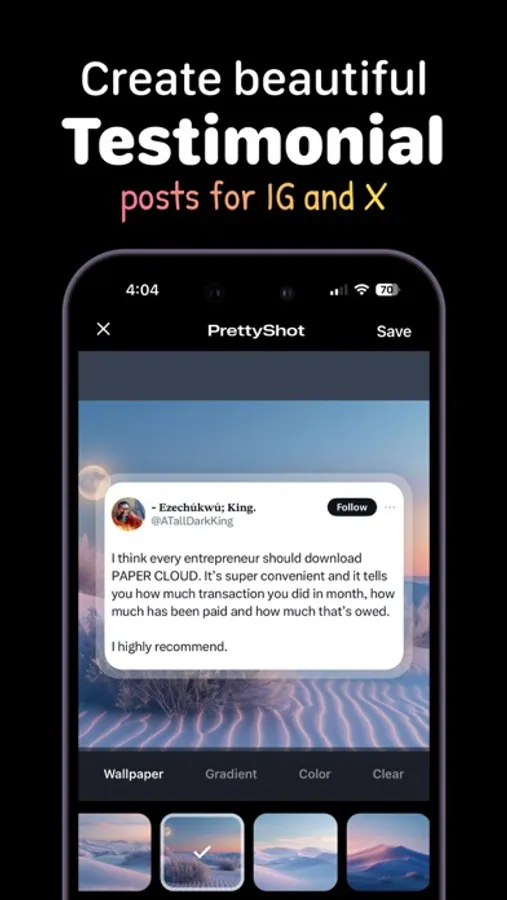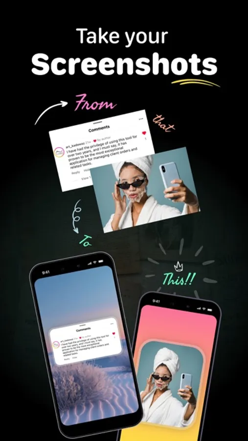 …from your phone - Instantly preview your screenshots/photos against vibrant and colorful wallpaper backgrounds, eye-popping colors, and gradients - Export. Boom! You’re done!