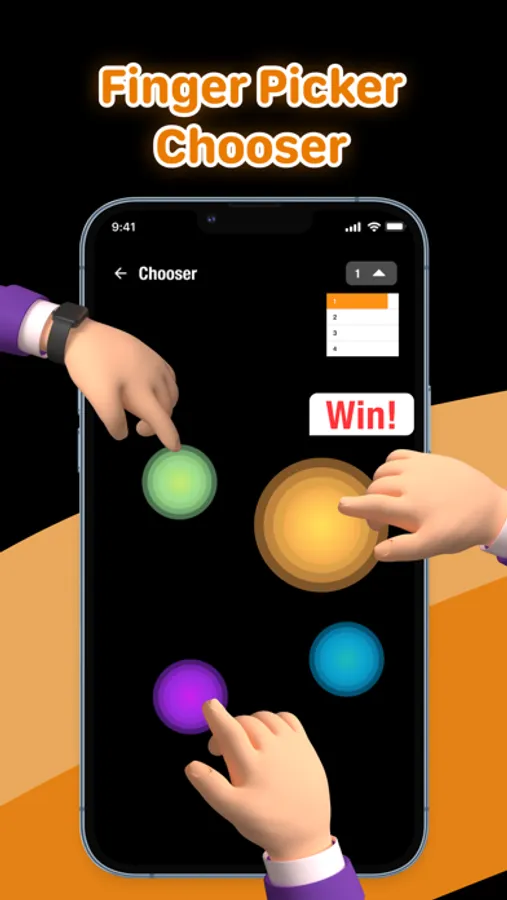 - Finger Picker Chooser: Tap the screen and colorful dots representing participants appear, randomly selecting one lucky individual. Perfect for fair and fun selections!