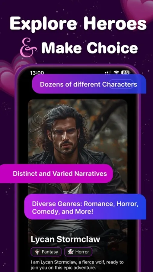 Dive into a multitude of genres such as romance, comedy, horror, and detective. Each character you meet offers a unique adventure waiting to unfold. From heartwarming romances to spine-chilling mysteries, Lore Chat has it all!