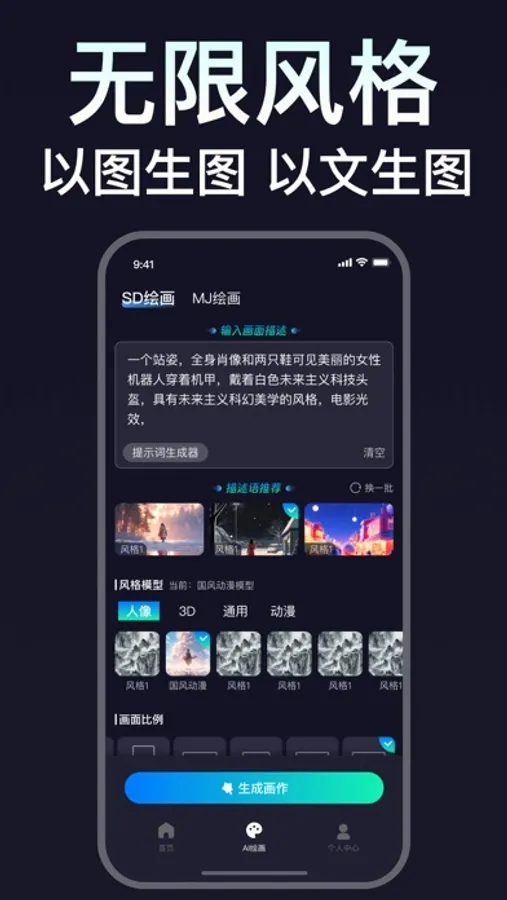 欢迎来到一个让你的想象翻江倒海的神奇世界——一个只需一键,就能让你的创意火花转化为眩目艺术品的地方。我们将SD与MJ绘画技术的力量融合于“一键生图”,为你铺设通往艺术宝藏的彩虹桥。