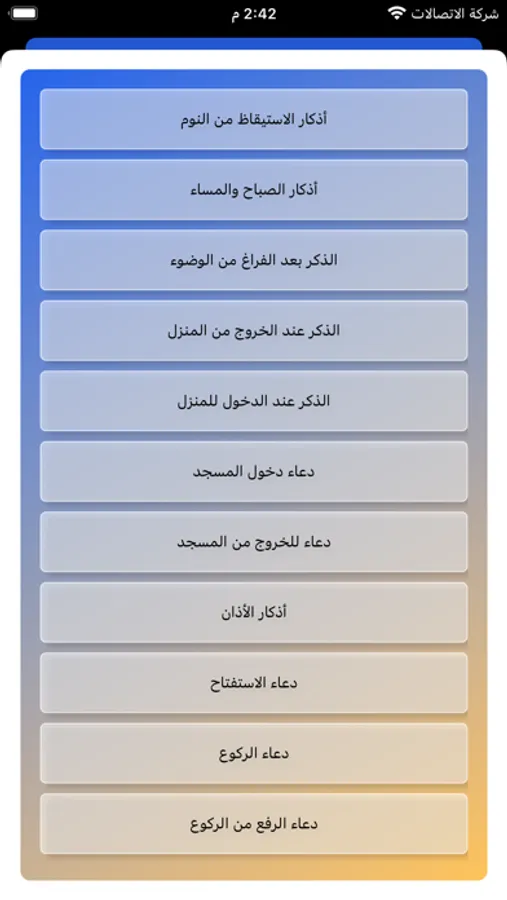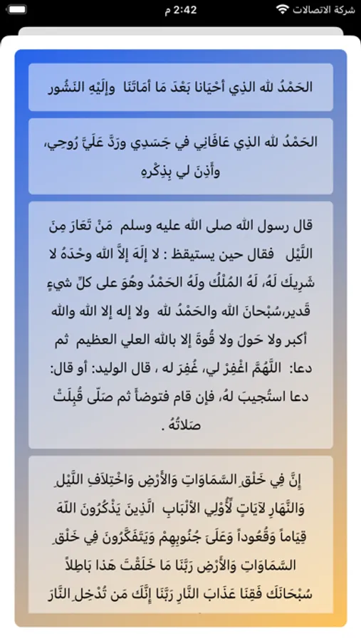 - الأذكار: أذكار الصباح والمساء، أذكار النوم والاستيقاظ وغيرها ، مع عداد للتسبيح