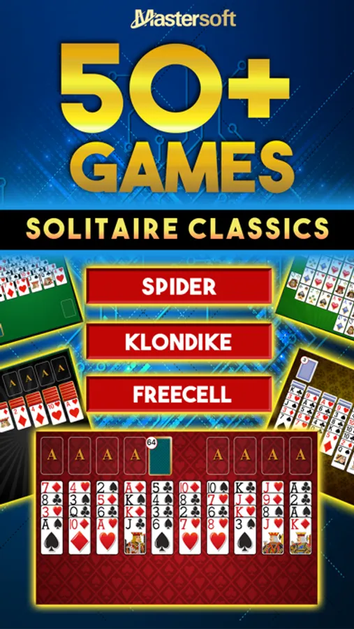 KLONDIKE, TRIPEAKS, SPIDER, FREECELL, PYRAMID, CANFIELD, YUKON, THIEVES OF EGYPT and more ... 50 in total!