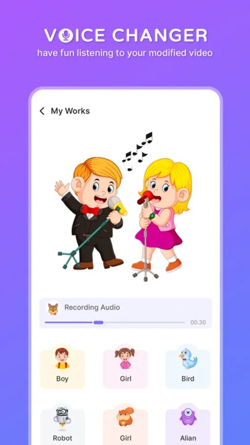 With this voice changer app, you can easily change your voice into different voice avatar and voice effects. What you need to do is only record or select audio and apply the voice effects provided in this voice app. Then you can share the funny voice effects or upload it to social media. You can also use this singing voice changer to make more music effects and song effects.