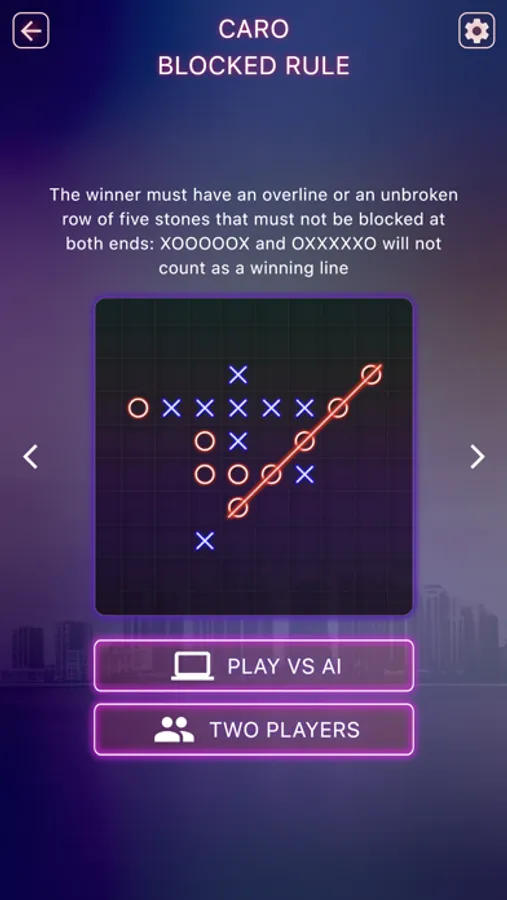+ Caro: In Caro, (also called gomoku+, Co Caro, popular among Vietnamese), the winner must have an overline or an unbroken row of five stones that is not blocked at either end (overlines are immune to this rule). This makes the game more balanced and provides more power for White to defend.