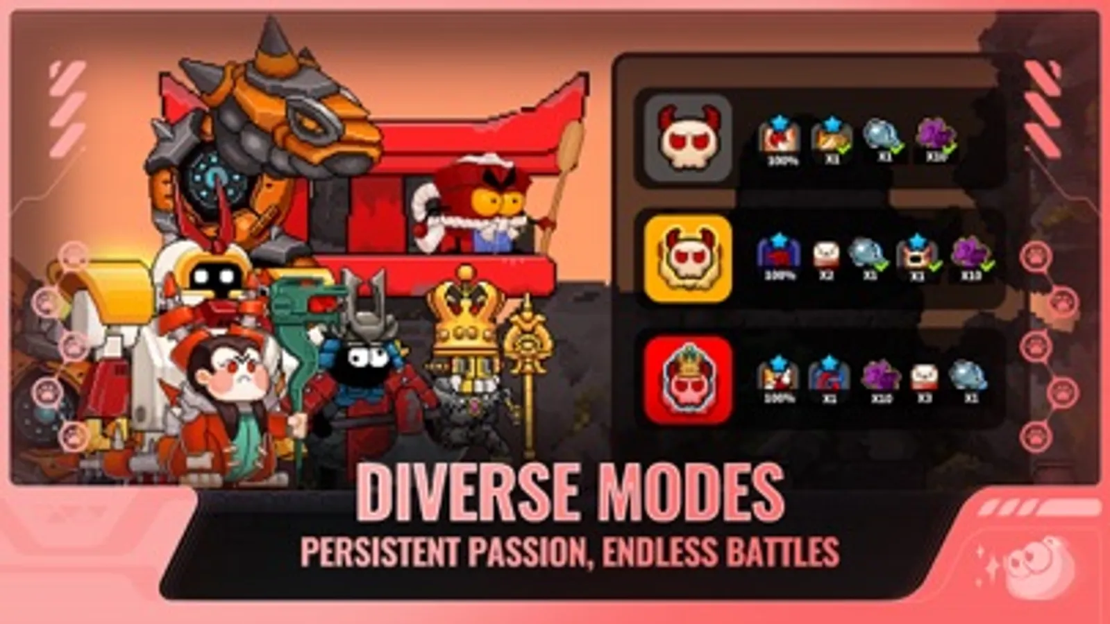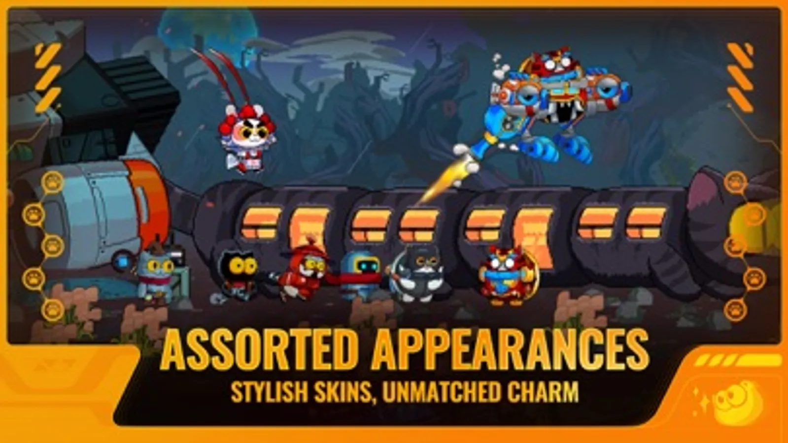 Cute cats are a must, but there's more! Meet the crafty Dragonbird, the hot-tempered Explorilla, the goofy Pitaya, the ninja Sparrow, and more... Each character boasts unique weapons, skills, and irresistibly charming personalities. From melee combat to shooting, magic to guns, or just simply being adorable, their competence extends across all fields.
