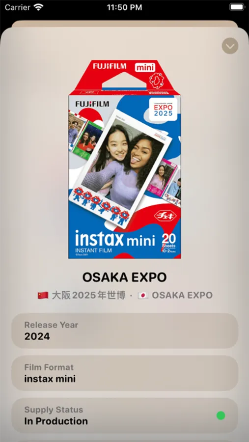 ● Comprehensive film database: Access detailed information on various instant films, including film styles, release years, and discontinued statuses.