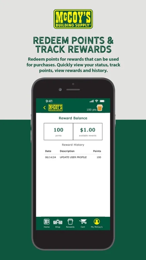 Redeem points for rewards that can be used for purchases. Quickly view your status, track points, view rewards and history.