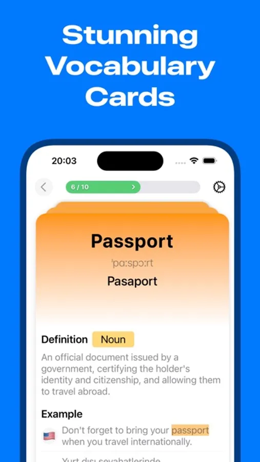 ▸▸▸ Beautifully Designed Vocabulary Cards: Explore our visually stunning vocabulary cards, each featuring an example sentence in your native language to help you grasp new words quickly and intuitively.