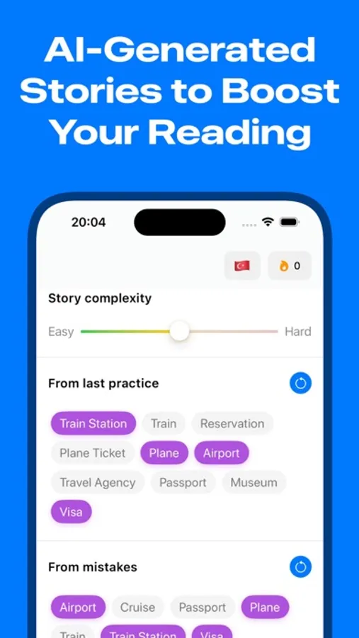 ▸▸▸ AI-Generated Stories: Practice your vocabulary by creating and saving stories that use the words you’ve learned. Improve your reading skills and build a collection of personalized stories.