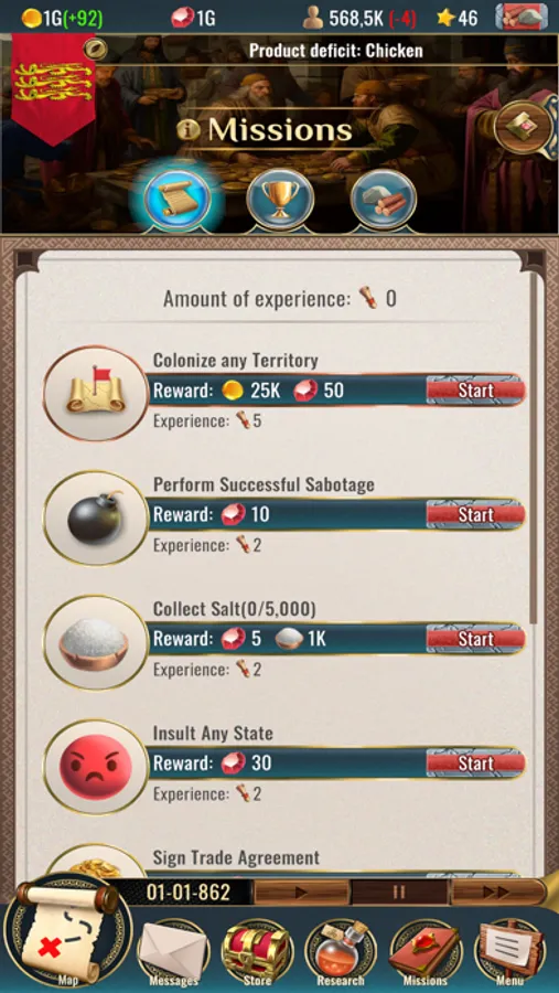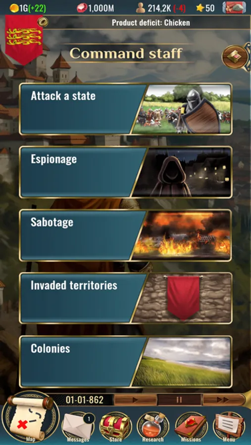 - Trade – organize trade with other countries, buy and sell food, resources and military equipment.