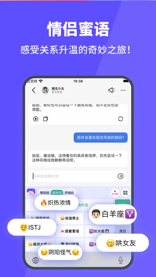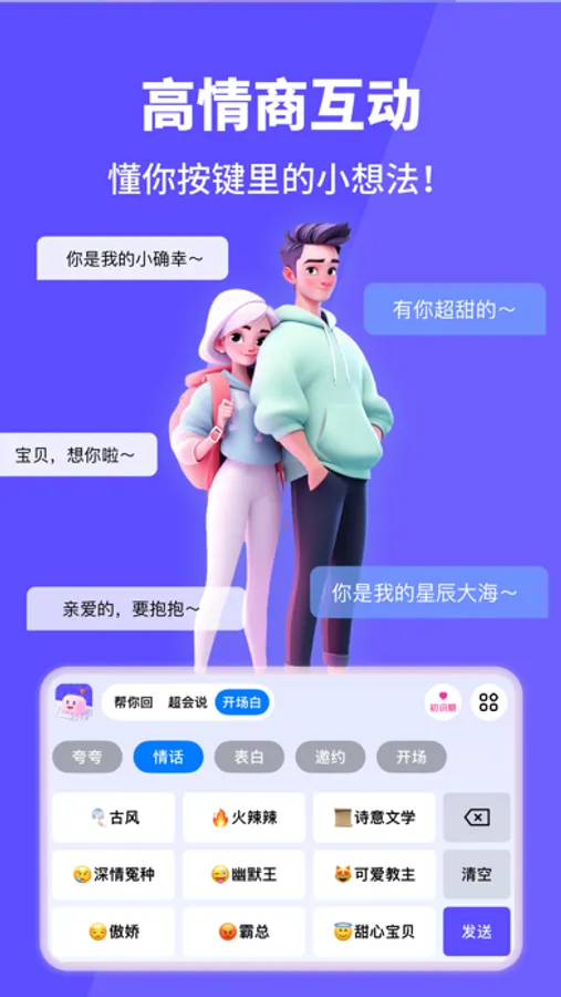 - 甜蜜情侣专区:打造甜蜜氛围,简直太会了!浪漫诗人型,为您书写爱的华章。贴心暖男/温柔淑女型,时刻送来温暖呵护。活泼俏皮型,让相处时刻充满欢歌笑语。