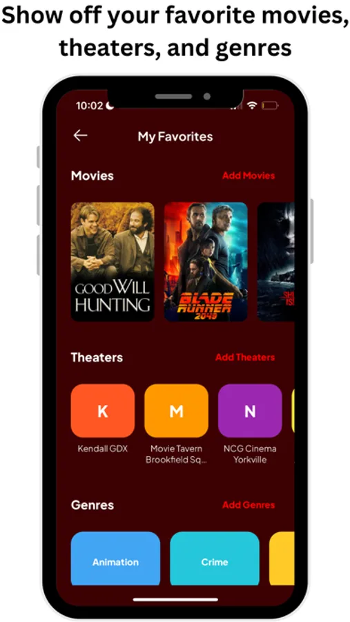 Your profile page is yours to customize. Submit a profile picture and write a short bio to tell people a little bit about yourself and your taste in movies. This is also where you can access all of your past tickets, see which movies you’ve added to your queue, and view tickets you’ve saved to your archive and decided not to post. Your profile also houses your “My Favorites” page, where you can add your favorite movies, theaters, and genres.