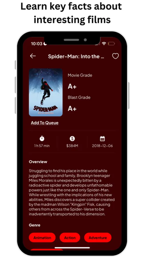 In the Movies tab, you’ll be able to scroll through trending films, or all-time hits. Just simply tap on the poster of a movie that you’re interested in to view its average Movie Grade and Blast Grade, as well as some other key information like release date, box office return, runtime, and a quick plot synopsis.