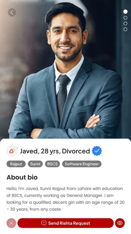 Create a detailed profile to showcase who you are, and utilize our smart search to find compatible matches based on your preferences. Rishta Dil Ka offers advanced features like personalized matchmaking, verified profiles, and a secure system to search for genuine marriage proposals and rishtay for yourself, your children, siblings, friends, and relatives.