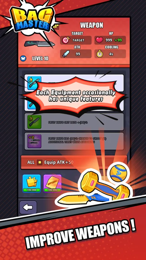 Do you like bag storage? Can you perfectly put the weapon into your bag? Whether you like it or not, you will love the new bag features brought to you by the bag master! From an empty bag to being filled with top-notch weapons, each identical weapon can be synthesized into a stronger weapon. Use your desired weapon to repel enemies and become a true bag master! You can mix and match your weapons as you please. Each weapon has unique functions and is something that can be seen everywhere in life. Of course, each weapon is not alone. If you place them adjacent to your bag, you will be pleasantly surprised as they have different "chemical reactions"