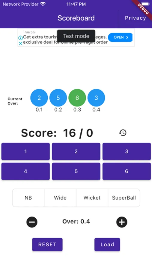Add extra runs for No Ball, Wicket, or Wide by pressing the respective button with the numbers 1 to 6.
