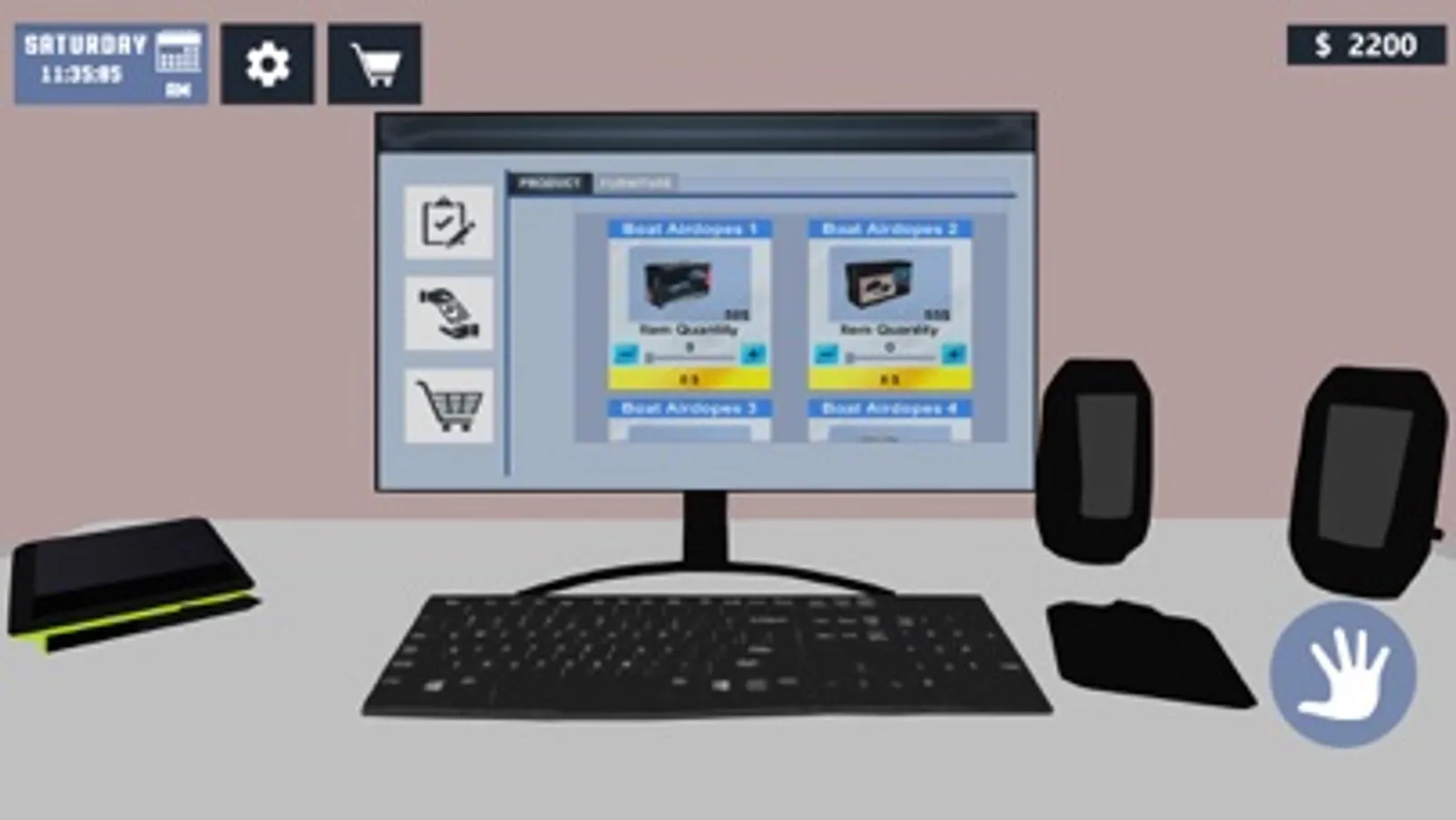 As a smart electronics retail manager, sell headphones, smartphones, tablets, cameras, computers, and other electronic products in your electronic shop. Purchase additional furniture to expand the shop's size and scope.