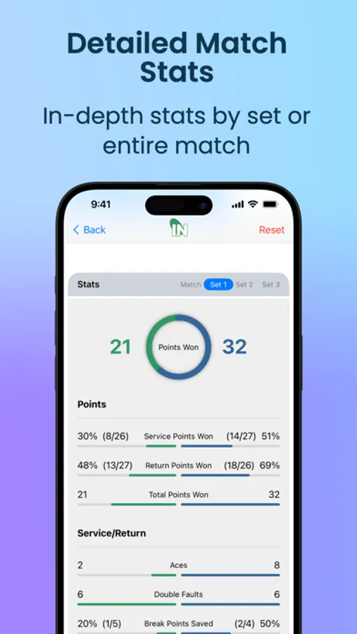 - In-Depth Statistics: Gain comprehensive insights with detailed stats for a single set or the entire match. Analyze key performance metrics such as points won, service points, return points, and more.