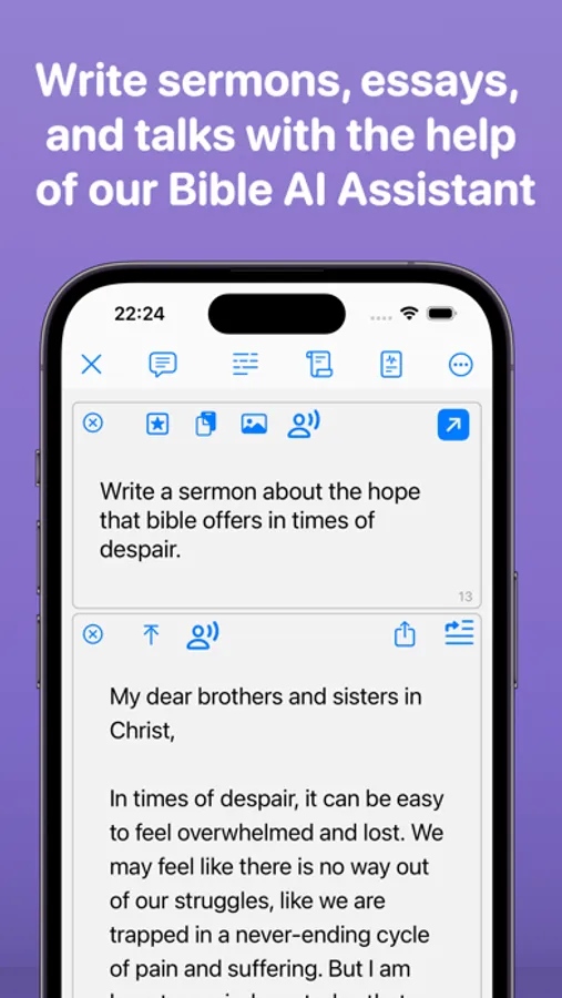 - AI Bible Helper: Chat with our AI assistant to discuss the Bible, faith, life, and God. Get your questions answered, gain valuable insights, and benefit from features like reading aloud verses and pages with Text to Speech, translation, and generating text such as sermons, essays, talks, prayers, verse explanations, and more.