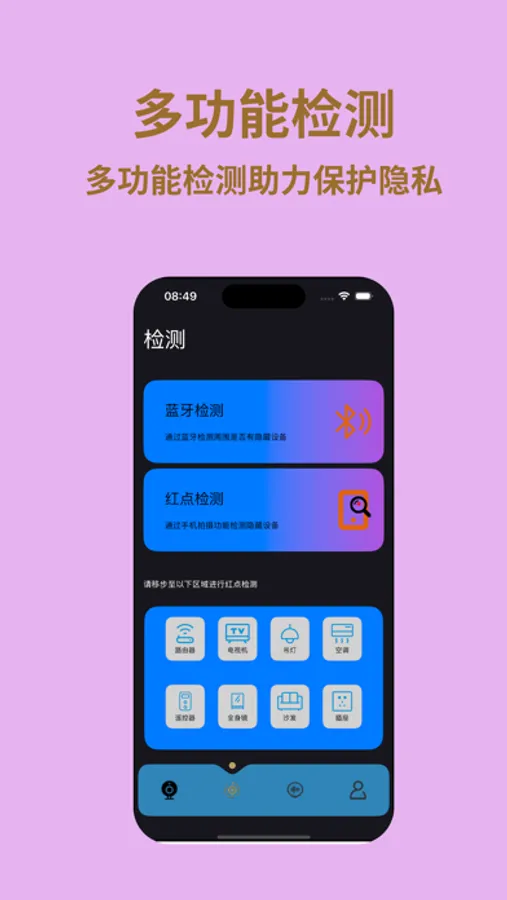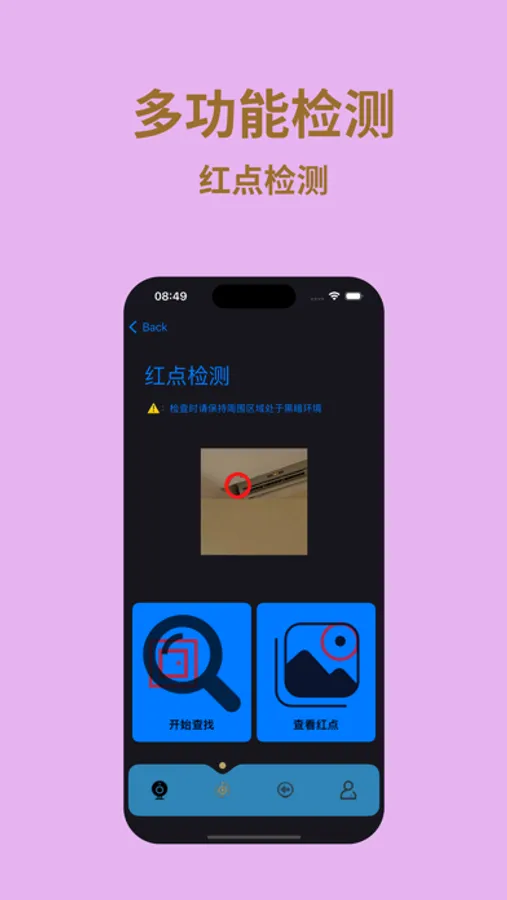 多功能检测-红点检测:罗列了9个区域可能存在的隐藏设备的场景,利用相机在黑暗环境中抓取红点,此操作需要用户手动配合。