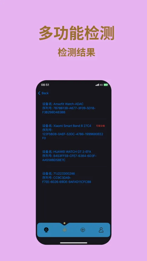 多功能检测-蓝牙检测:罗列出当前住宿环境下所有可用蓝牙设备,并根据蓝牙信息判断是否存在可疑设备,用户亦可对清单进行检查。