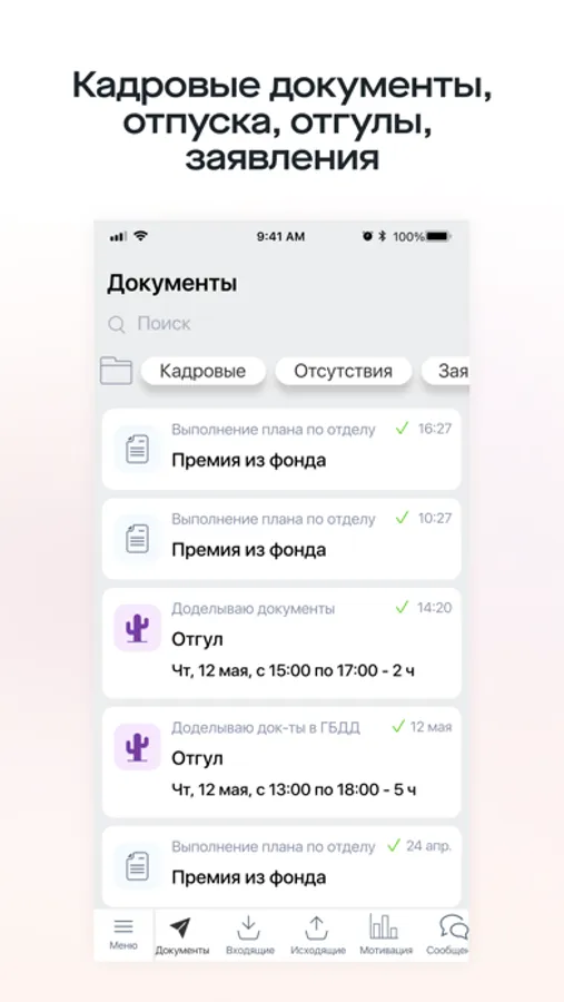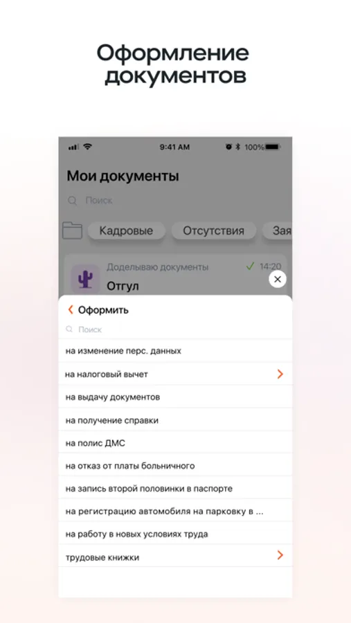 • Организация кадровых процессов: оформление документов, приемы на работу, изменения в должностях, отпуска, компенсированные отгулы, подача заявлений — все это можно сделать непосредственно в приложении.