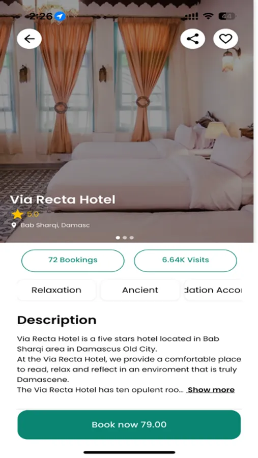 Welcome to Rahal, your trusted companion for booking hotels, planning and booking trips to Syria in a completely safe and secure way. Whether you're an adventurous explorer or a culture enthusiast, our app is designed to make your travel experience to Syria seamless and worry-free. Discover a vast selection of handpicked hotels, ranging from luxurious accommodations to budget-friendly options, all verified for their safety and quality. With real-time availability and competitive prices, finding the perfect hotel for your stay has never been easier. Plan or book your dream trip with confidence as Rahal provides comprehensive travel options, including guided tours, sightseeing packages, and trips. Immerse yourself in the rich heritage and captivating landscapes of Syria in Damascus, Aleppo, Palmyra, Latakia, Tartus, and Homs, all while enjoying the peace of mind that comes with our commitment to safety.