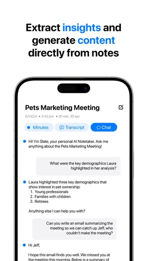 Minutes AI automatically does your meeting notes and transcriptions with AI. Minutes records audio and provides word for word transcripts with speakers labels. Then, it gives you formatted notes, summaries, and the ability to search for key terms/topics. You can ask questions like “What stats did Laura reference on her slide?.”