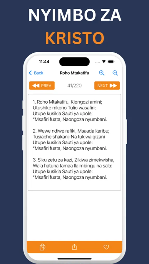 This app enables you to zoom in and out the song texts to suit your visibility. You can quickly do these in the song display screen. You can also mark any song favourite easily from this page using the like button at the bottom.